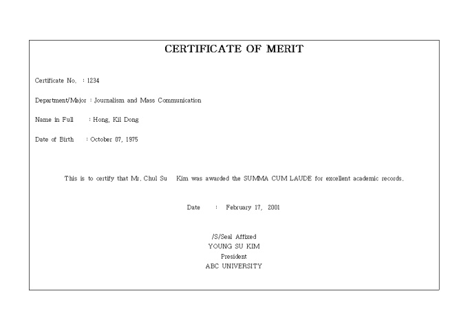 대학에서 학생에게 수여하는 상장 양식입니다. 샘플이나 세부 내용은 변경하여 사용하세요.
