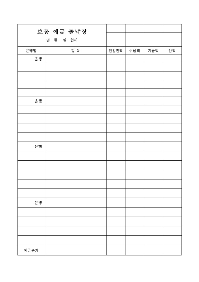보통예금의 출납(입출금내역)을 기록하는 양식입니다. 기본틀로 구성되어 있어 직접 편집하여 사용하시면 됩니다.