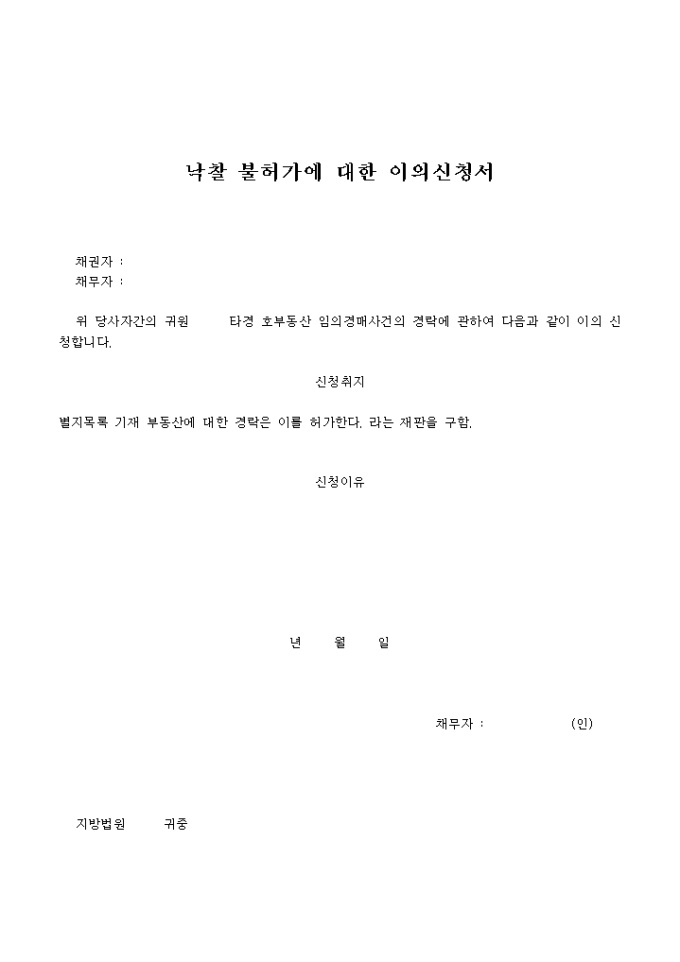 9,000원/월부동산 경매서식입니다. 낙찰 불허가 결정에 대한 이의 신청서 양식입니다. 청구이유는 본인이 직접 기입을 하시면 됩니다.