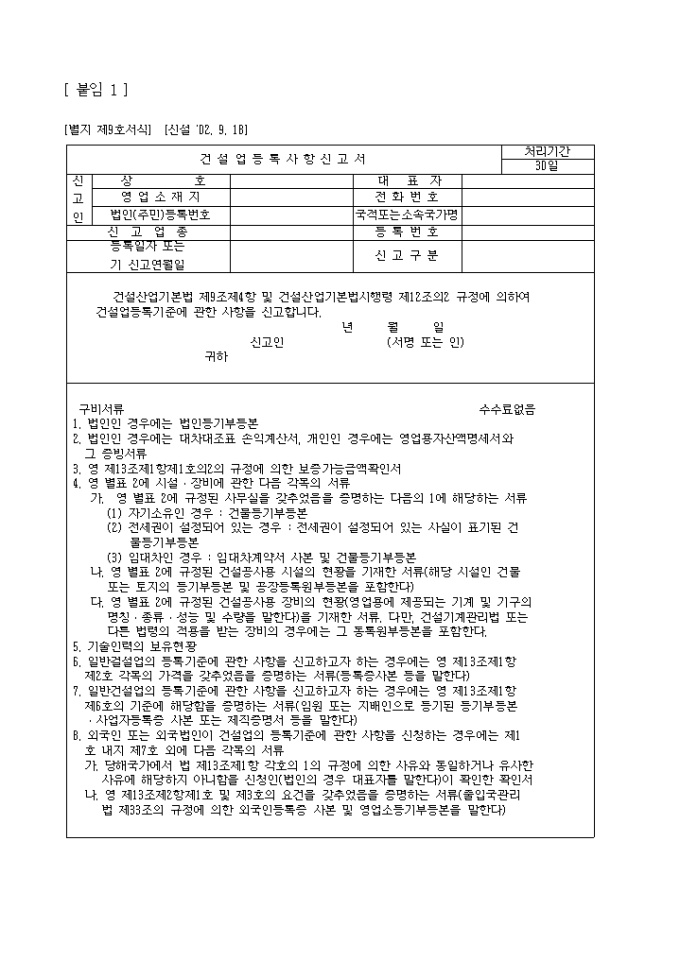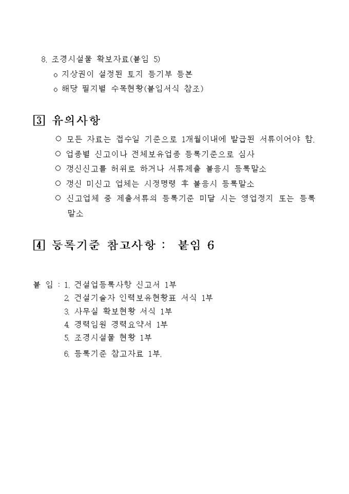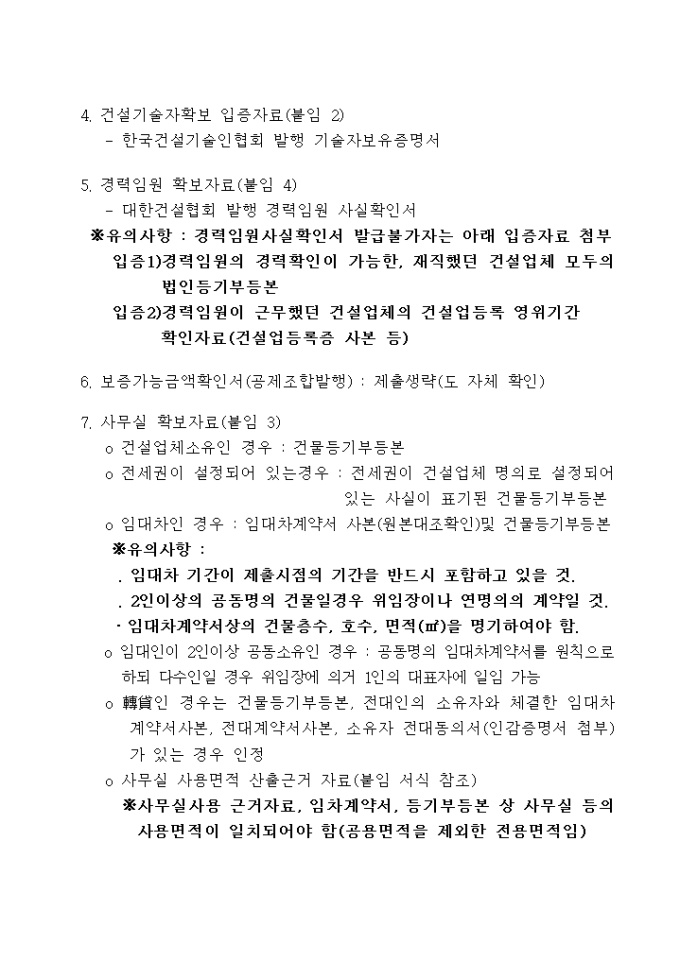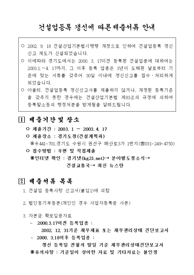 9,000원/월건설업등록 갱신에 따른 제출서류 안내문과 관련서식입니다. 제출기간 및 장소, 제출서류 목록, 유의사항, 등록기준 참고사항 등이 안내 되어 있습니다.