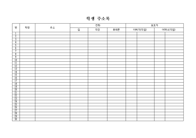 9,000원/월학교에서 사용하는 학생들의 주소록 양식입니다. 성명, 주소, 전화, 보호자 성명을 기재합니다.