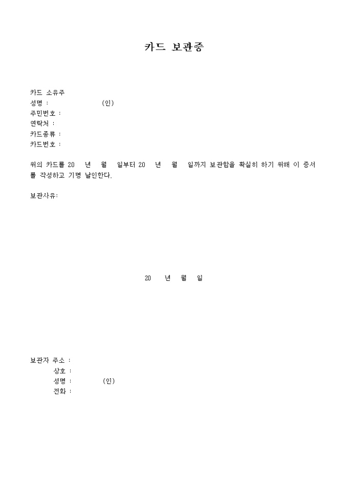9,000원/월카드소유주,보관자,보관사유를 기록하는 양식입니다.