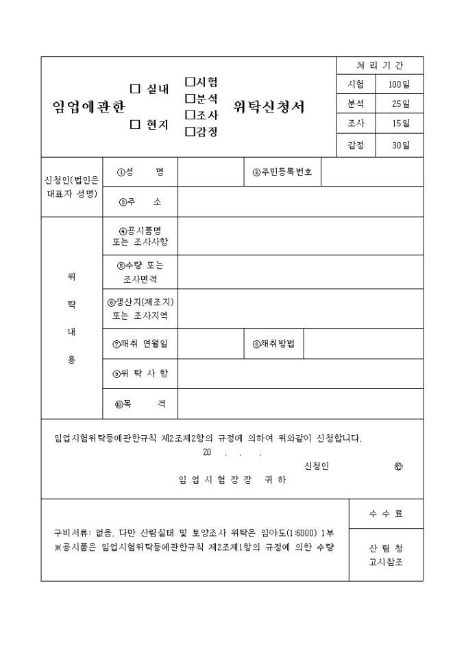 9,000원/월임업시험위탁등에관한규칙 제2조제2항의 규정에 의하여 위와같이 신청하고자 할 때 사용하는 "임업에 관한(실내,현지) (시험,분석,조사,감정) 위탁 신청서" 양식입니다.