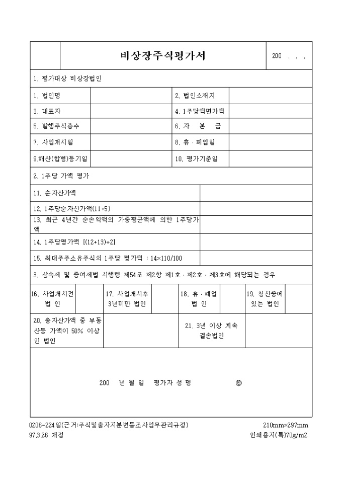 비상장 주식을 평가할 때 사용하는 양식입니다.