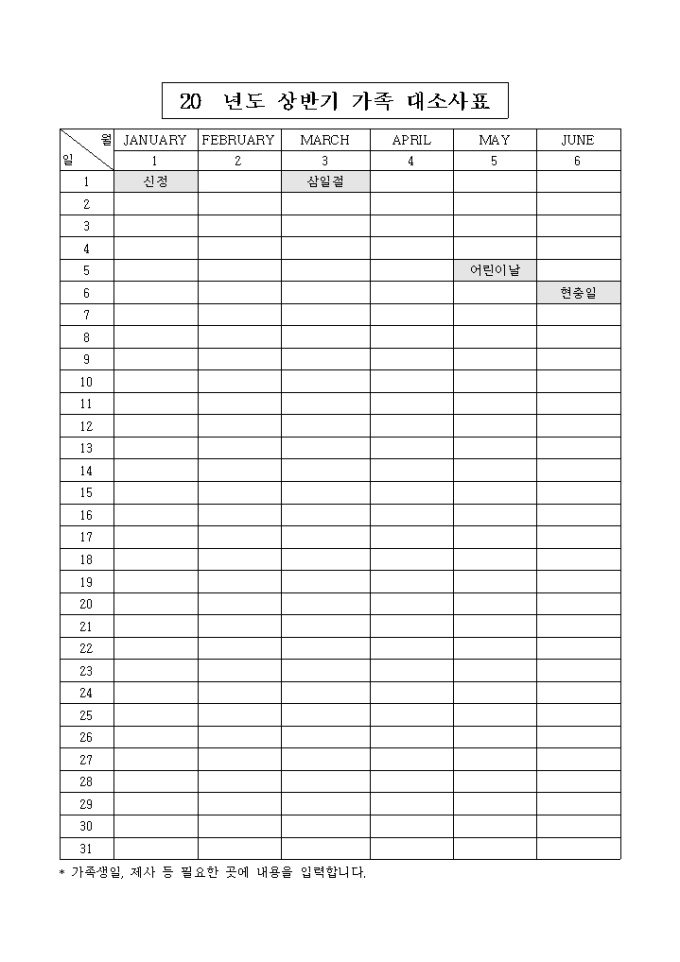 9,000원/월2004년도 상반기 가족의 행사일정을 기입하는 대소사표양식입니다.