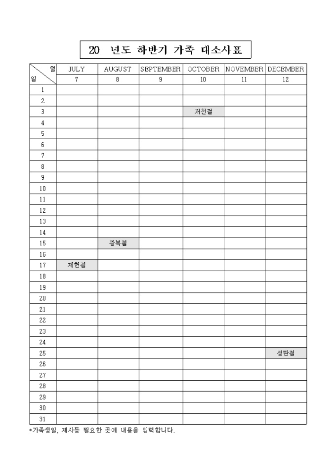 2004년도 하반기 가족의 행사일정을 기입하는 대소사표양식입니다.