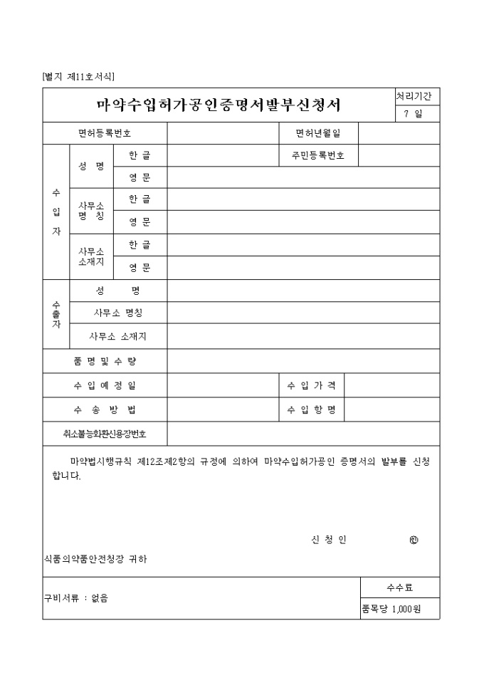 9,000원/월마약법시행규칙 제12조제2항의 규정에 의하여 마약수입허가공인 증명서의 발부를 신청할 때 사용하는 마약수입 허가공인 증명서 발부신청서 양식입니다.