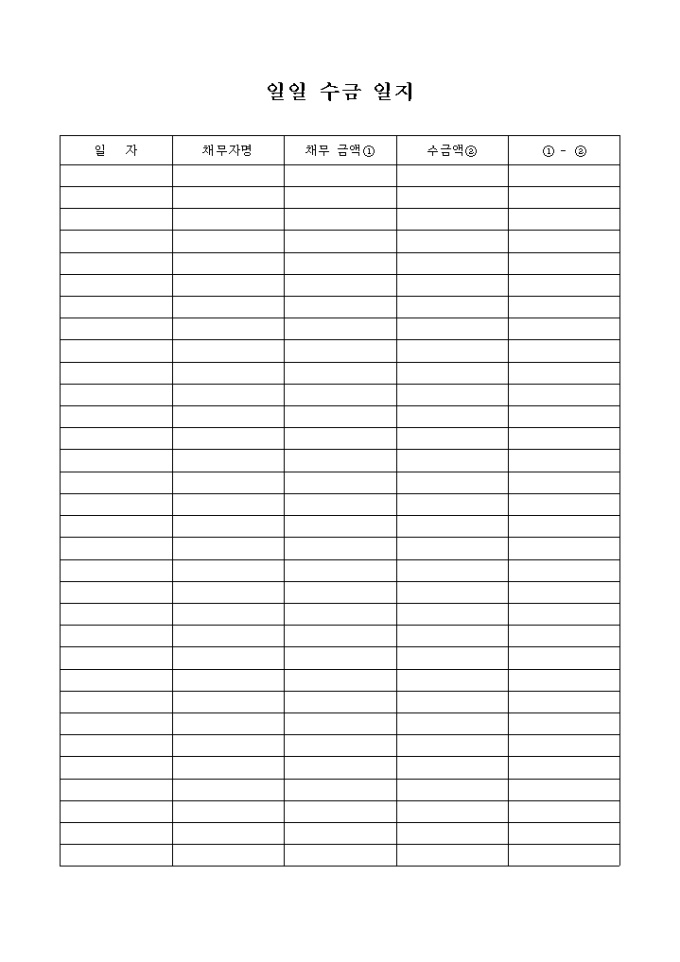 9,000원/월일자 및 채무자명, 채무금액, 수금액, 수금차액을 기록되어 있는 채권액을 수금기록하는 일일 수금 일지(채권) 양식입니다.