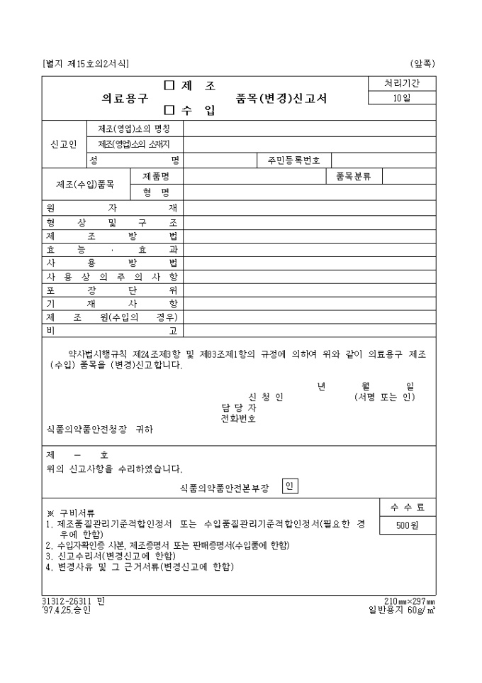 9,000원/월약사법시행규칙 제24조제3항 및 제83조제1항의 규정에 의하여 위와 같이 의료용구 제조(수입) 품목을 (변경)신고할 때 사용하는 "의료용구(제조,수입) 품목(변경)신고서" 양식입니다.