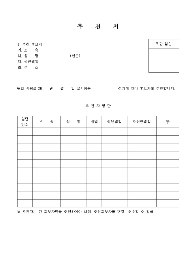 선거 후보자를 추천할 때 사용하는 양식입니다.