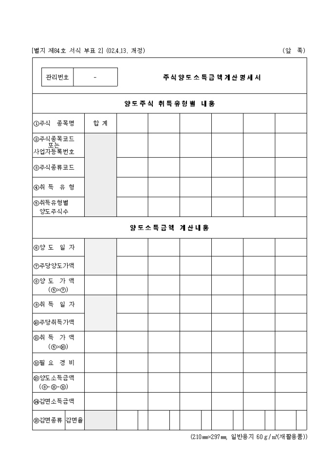 주식양도 소득금액 계산명세서(02.4.13. 개정)