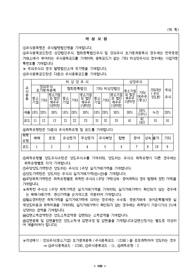 ②주식종목코드란은 상장법인주식, 협회등록법인주식 및 장외주식 호가중개종목의 경우에는 한국증권거래소에서 부여하는 주식종목코드를 기재하며, 종목코드가 없는 기타 비상장주식의 경우에는 사업자등록번호를 기재합니다.