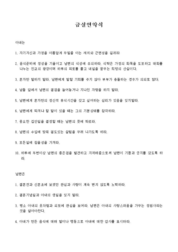 남편과 아내가 지켜야할 사항을 기술한 금실언약서 양식입니다.