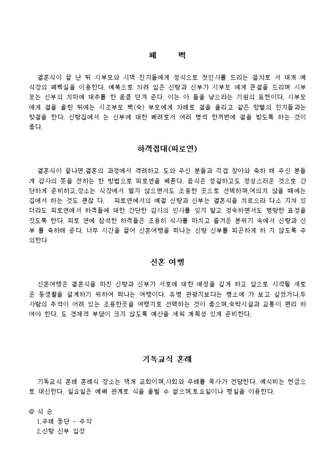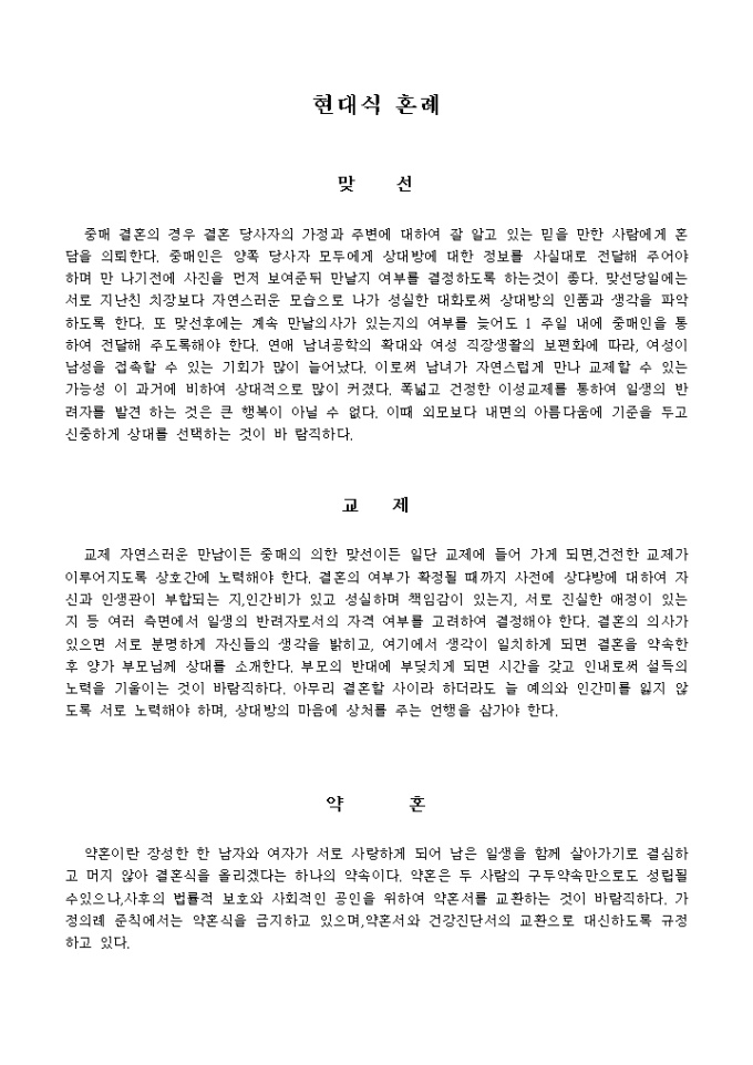 9,000원/월맞선 및 교제, 약혼, 결혼혼수, 청첩장, 결혼식순, 폐백, 하객접대, 신혼여행 등에 대한 방법이 기술되어 있는 현대식혼례절차 양식입니다.