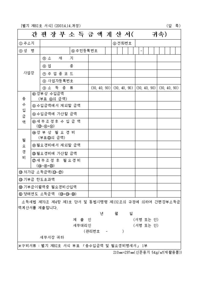 9,000원/월소득세법 제70조 제4항 제3호 단서 및 동법시행령 제132조의 규정에 의하여 간편장부소득금액계산서를 제출할때 사용하는 간편장부소득금액계산서( 귀속)(2003.09.30)입니다.