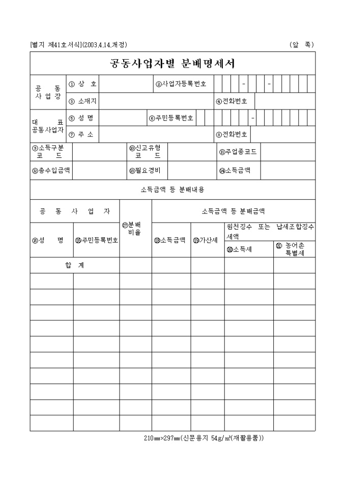 9,000원/월소득금액 등 분배내용을 기록하는 공동사업자별 분배명세서(2003.09.30)입니다.