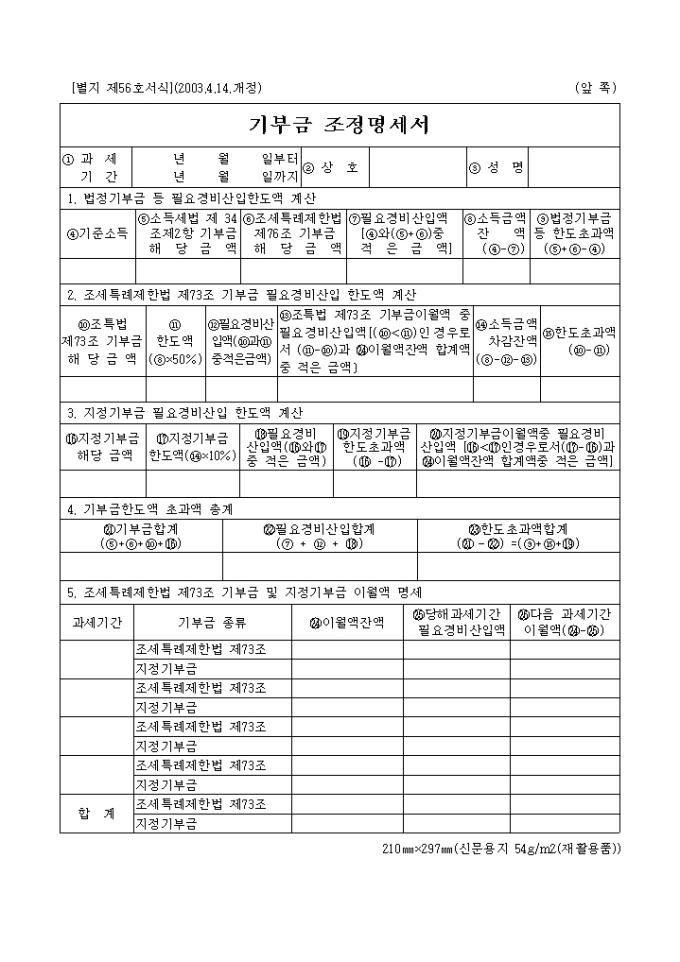 9,000원/월법정기부금 등 필요경비산입한도액 계산,조세특례제한법 제73조 기부금 필요경비산입 한도액 계산,지정기부금 필요경비산입 한도액 계산,기부금한도액 초과액 총계,조세특례제한법 제73조 기부금 및 지정기부금 이월액 명세 내역을 기록하는 기부금 조정명세서(2003.09.30)입니다.