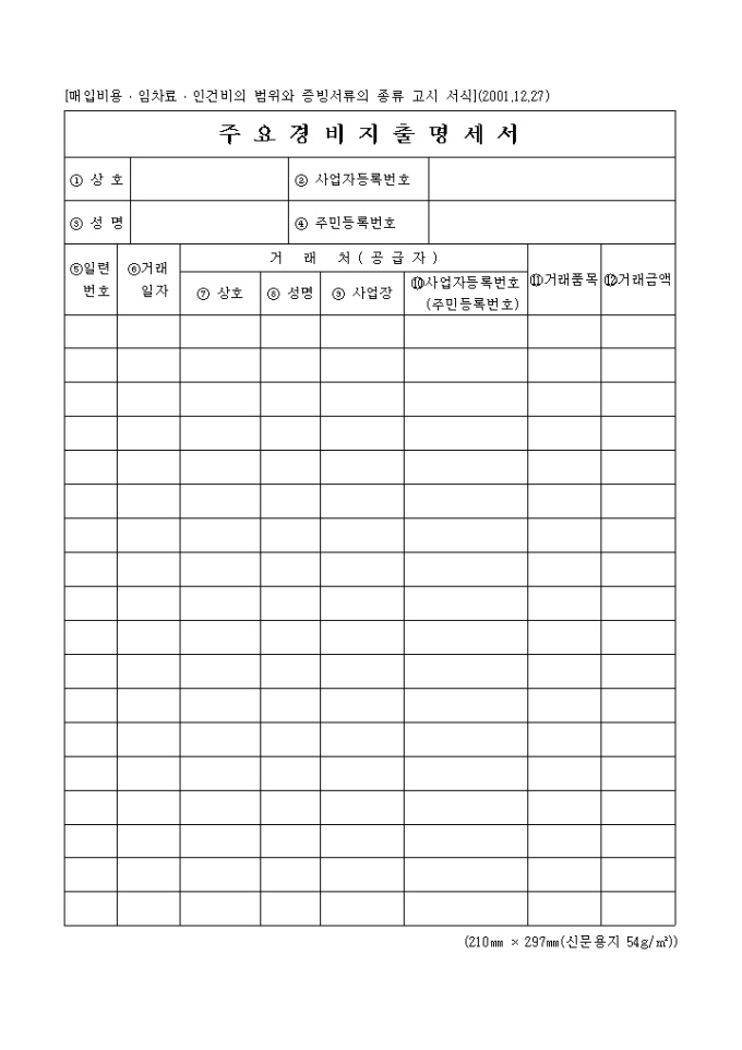 9,000원/월거래일자별 거래처 인적사항, 거래품목, 거래금액을 기록하는 주요경비지출명세서입니다.(2003.09.30)