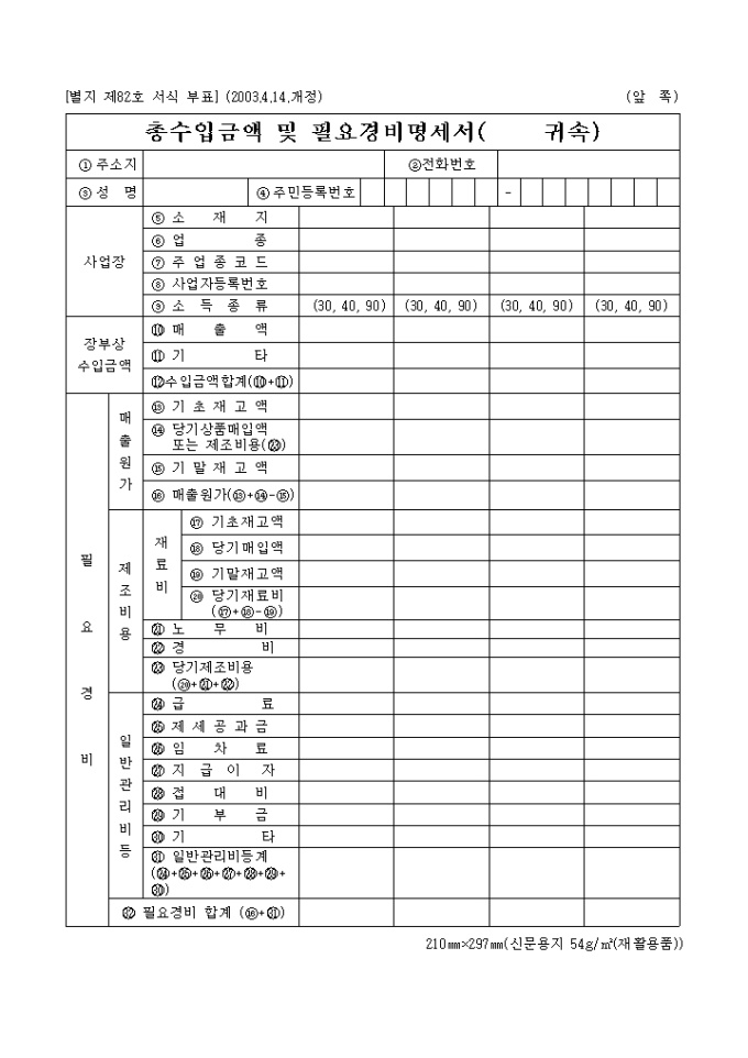 9,000원/월장부상 수입금액,필요경비명세를 기록하는 총수입금액 및 필요경비명세서( 귀속)입니다.(2003.09.30)
