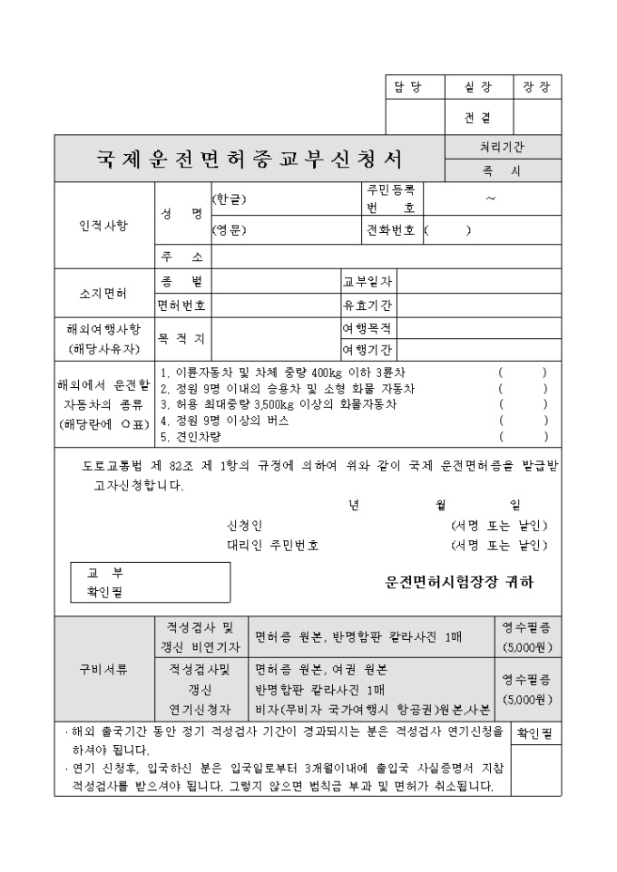 9,000원/월도로교통법 제 82조 제 1항의 규정에 의하여 국제 운전면허증을 발급받고자신청하는 운전면허 국제면허신청서 양식입니다.