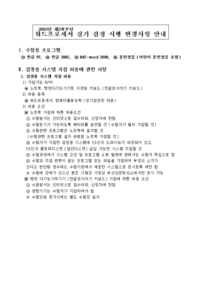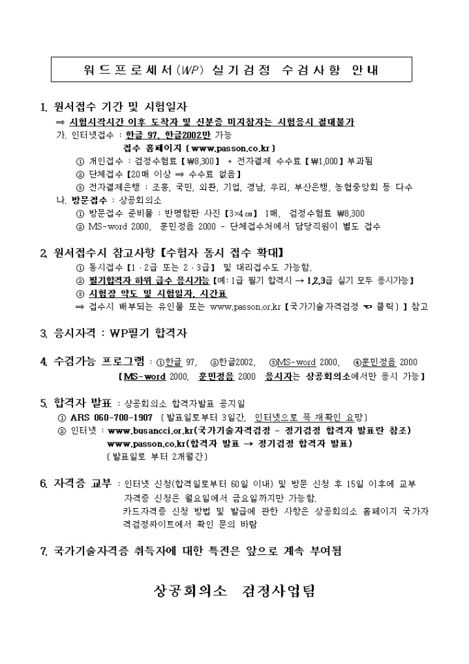 9,000원/월원서접수 및 시험일자, 응시자격, 수검가능 프로그램 등 유의사항이 기술되어 있는 워드프로세서(WP) 실기검정 수검사항 안내 양식입니다.