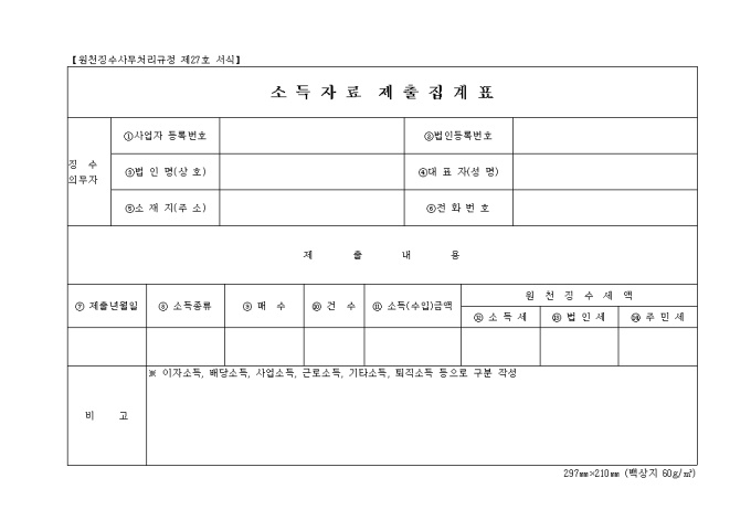 9,000원/월징수의무자 인적사항,소득종류,매수,건수,소득금액,원천징수세액을 기록하는 별지 제27호 서식 소득자료제출집계표입니다.