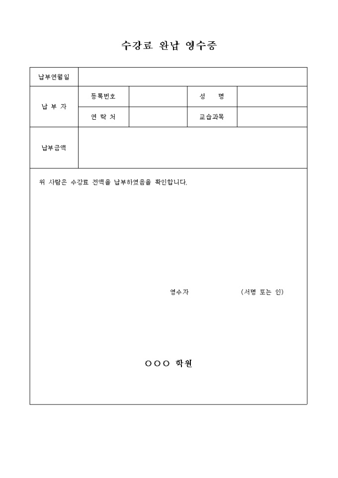 9,000원/월수강료 납부년월일, 납부자, 납부금액을 기록하고 수강료 전액을 납부하였음을 확인하는 수강료 완납 영수증 양식입니다.