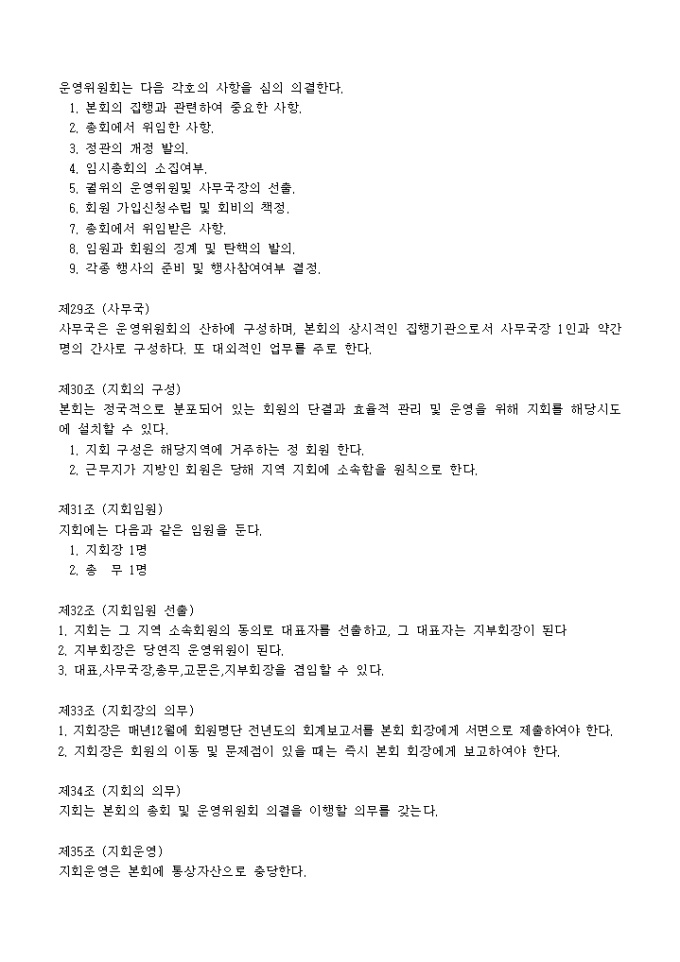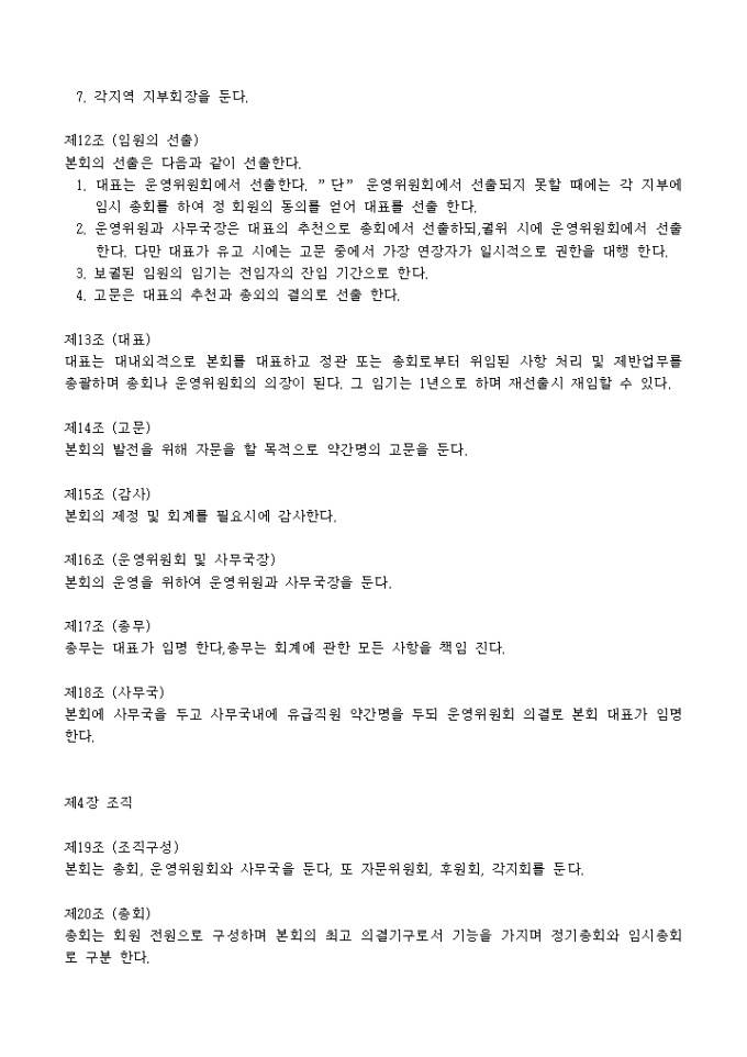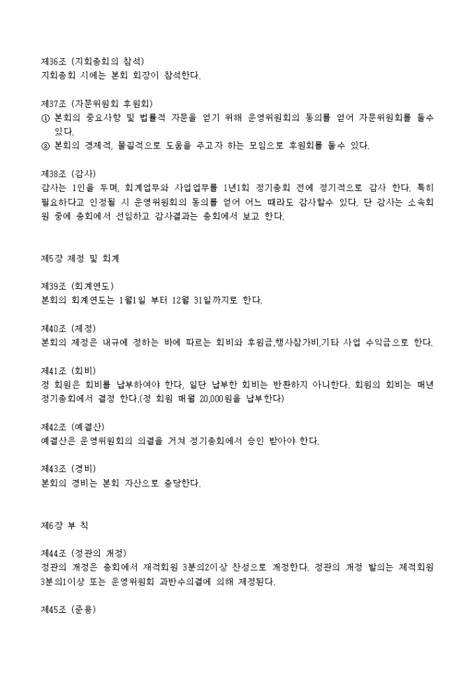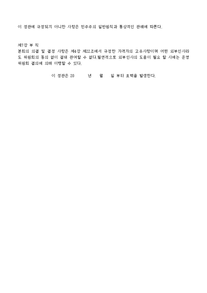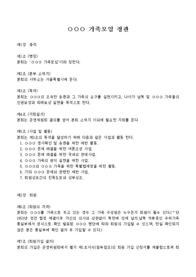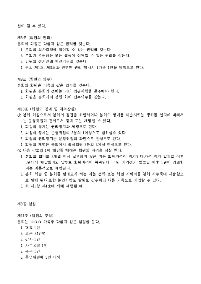각 장의 조항에 따라 가족모임을 운용하는 ○○○ 가족모임 정관에 대한 샘플 양식입니다.
