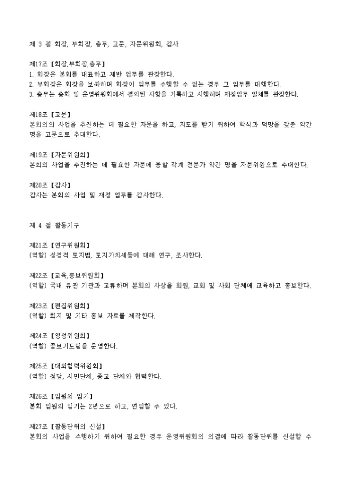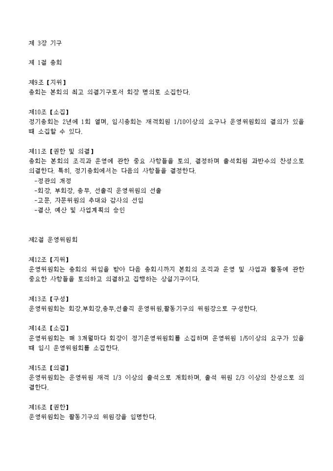 각 장에 대한 조항을 기록하고 모임을 운영하는 ○○○를 위한 모임을 위한 정관 샘플입니다.