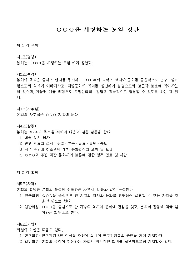 9,000원/월각 장에 대한 조항을 기록하여 모임을 운영하는 ○○○을 사랑하는 모임 정관에 대한 샘플양식입니다.