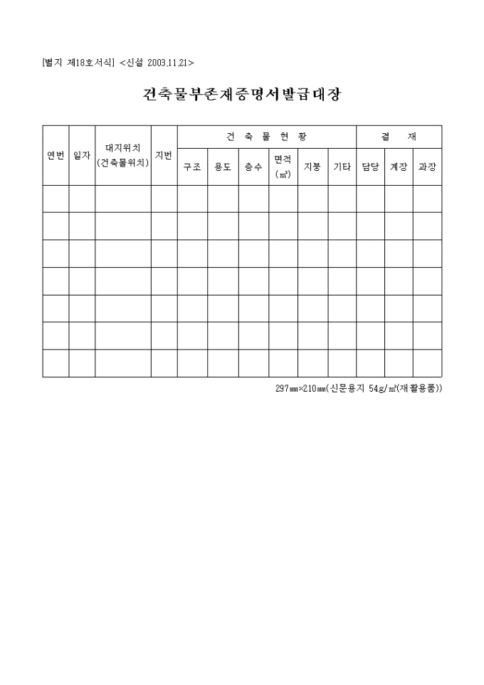 9,000원/월별지 제18호 서식(신설 2003.11.21)인 건축물 부존재증명서 발급대장입니다. 연번, 일자, 대지위치, 지번, 구조, 용도, 층수, 면적, 지붕, 기타, 결재 등을 기재합니다.
