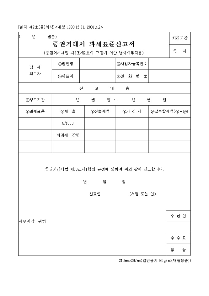 9,000원/월증권거래세법 제3조제2호의 규정에 의한 납세의무자용 증권거래세 과세표준신고서양식입니다. 별지 제2호(을)서식