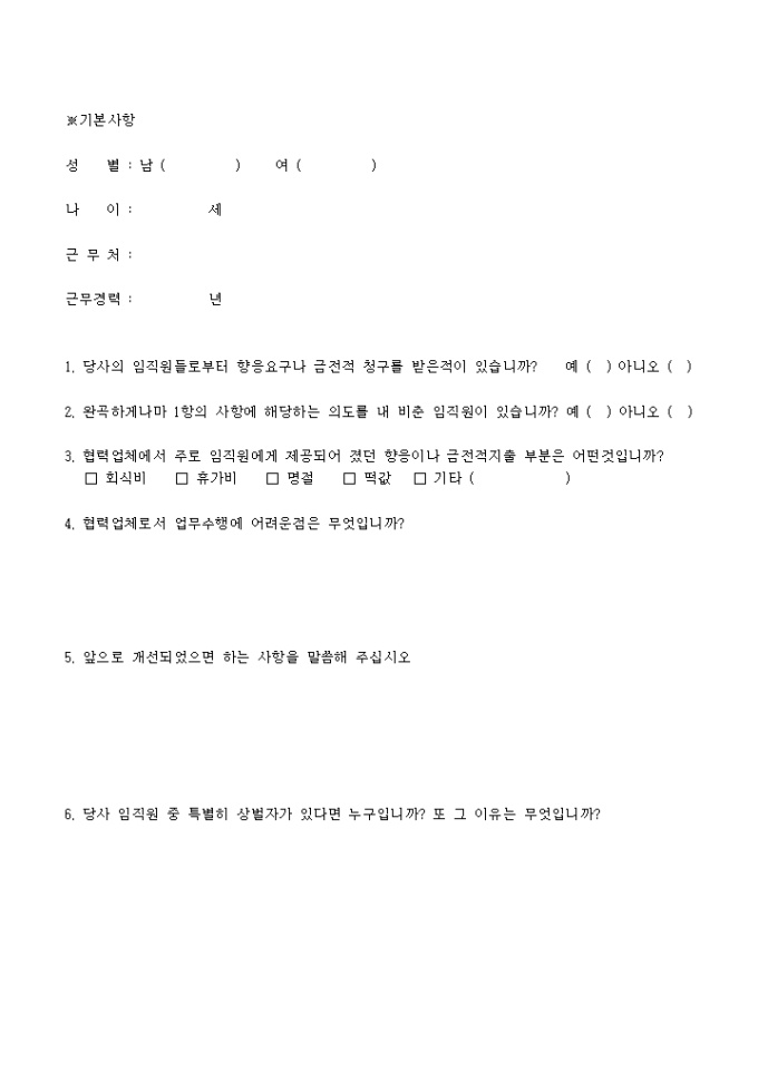 9,000원/월협력업체 관계 발전을 위한 설문조사서식입니다. 향흥이나 금전요구에 관한 조사내용입니다.