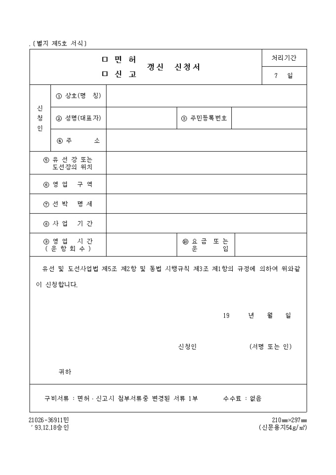 9,000원/월유선 및 도선사업법 제5조 제2항 및 동법 시행규칙 제3조 제1항의 규정에 의하여 위와같이 신청할 때 사용하는 "면허,신고 갱신신청서" 양식입니다.