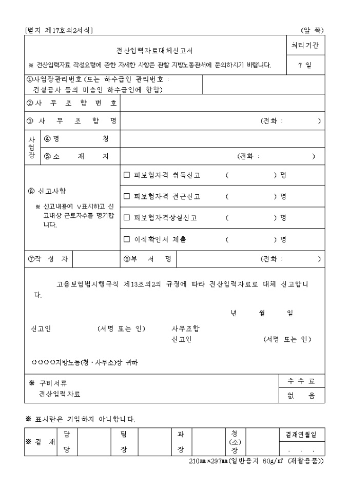 9,000원/월고용보험법시행규칙 제13조의2의 규정에 따라 전산입력자료로 대체 신고시 사용하는 양식입니다.