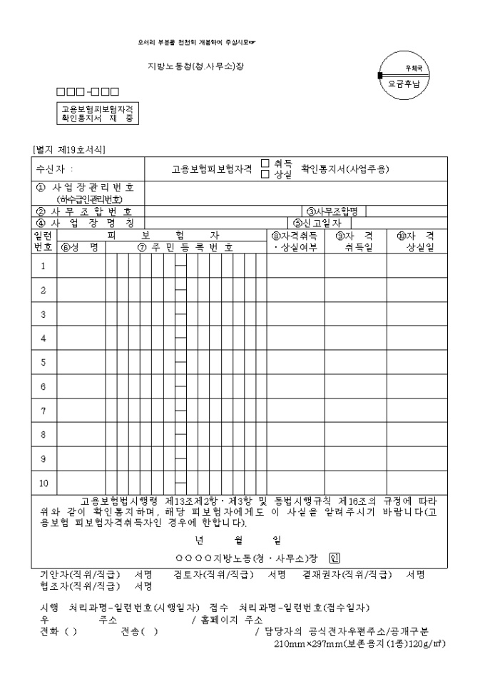 9,000원/월고용보험법시행령 제13조제2항·제3항 및 동법시행규칙 제16조의 규정에 따라 확인통지시 사용하는 양식입니다.
