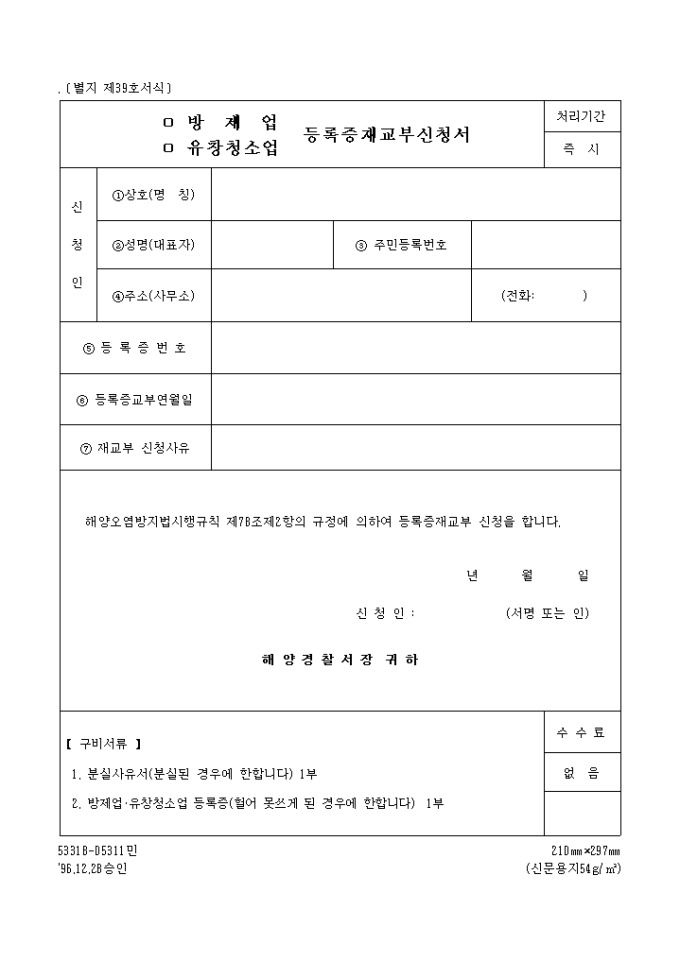 방제업, 유창청소업등록증재교부신청서