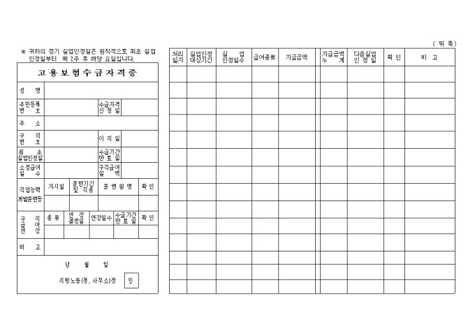 고용보험 수급자격증양식입니다.날짜별 수령확인 서명을 하도록 되어 있고, 처리일자, 실업인정대상기간, 실업인정일수, 급여종류, 지급금액, 다음실업인정일등의 내용을 기재하도록 되어 있습니다.