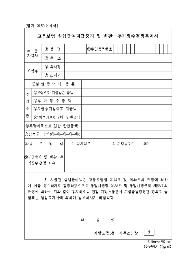 제59호 실업급여지급중지 및 반환, 추가징수결정 통지서(2004-01-08 개정)