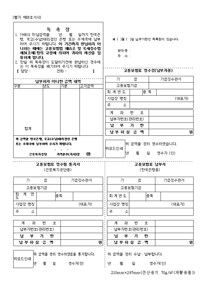 9,000원/월고용보험법 제65조 및 국세징수법 제24조제1항의 규정에 의하여 재산을 압류할 수 있음을 알릴 때 사용하는 양식입니다.