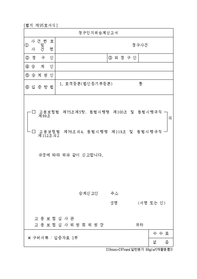 9,000원/월고용보험법 제75조제5항, 동법시행령 제100조 및 동법시행규칙 제99조 고용보험법 제76조의4, 동법시행령 제119조 및 동법시행규칙 제112조의2규정에 따라 청구인지위승계신고시 사용하는 양식입니다.