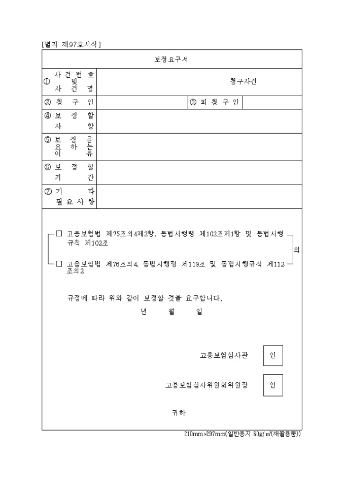 고용보험법 제75조의4제2항, 동법시행령 제102조제1항 및 동법시행규칙 제102조, 고용보험법 제76조의4, 동법시행령 제119조 및 동법시행규칙 제112조의2규정에 따라 보정요구시 사용하는 양식입니다.