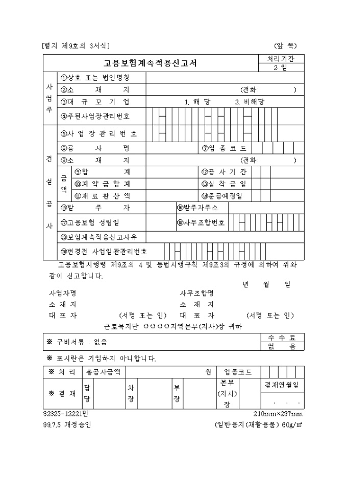 9,000원/월고용보험시행령 제9조의 4 및 동법시행규칙 제9조3의 규정에 의하여 계속적용신고시 사용하는 양식입니다.