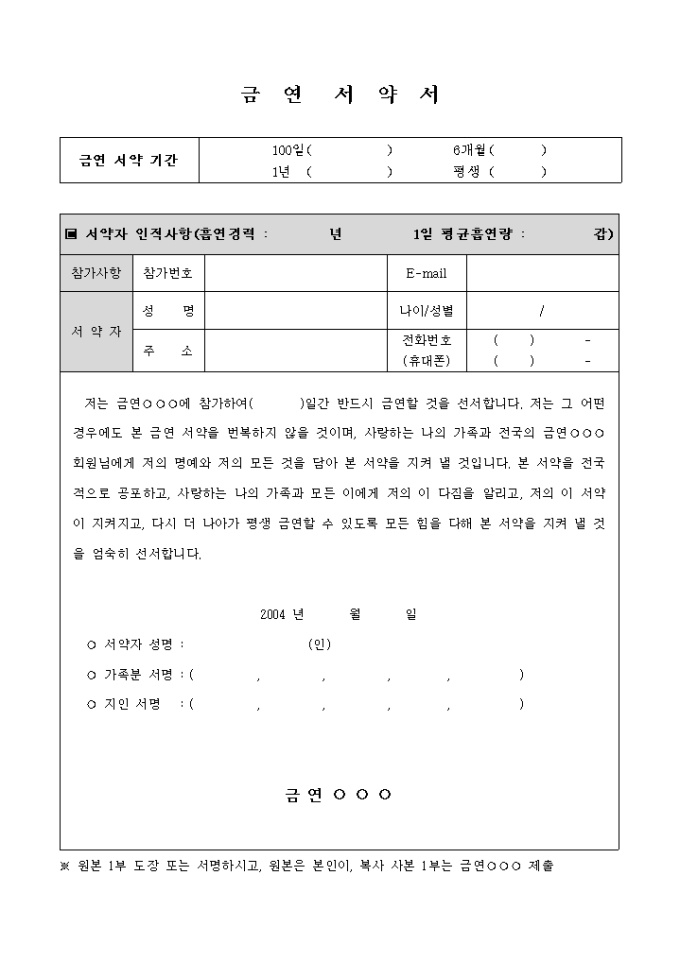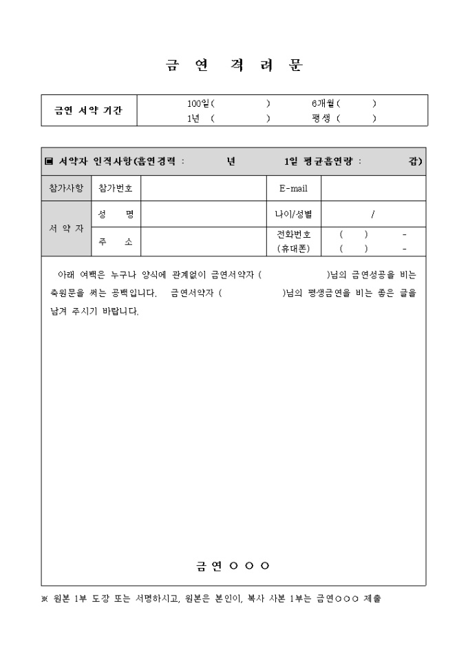 금연캠프나 각종 금연단체에서 합숙을 할 경우 사전에 받는 각서와 격려문 양식입니다.