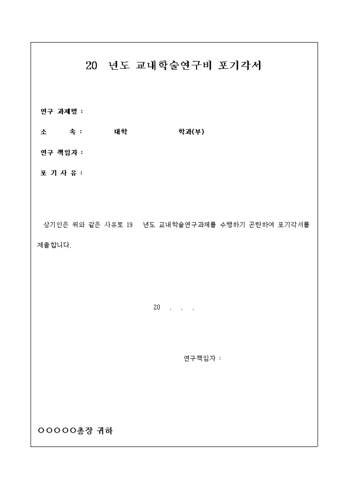 9,000원/월교내학술연구과제를 수행하기 곤란한 경우 제출하는 포기각서양식입니다.