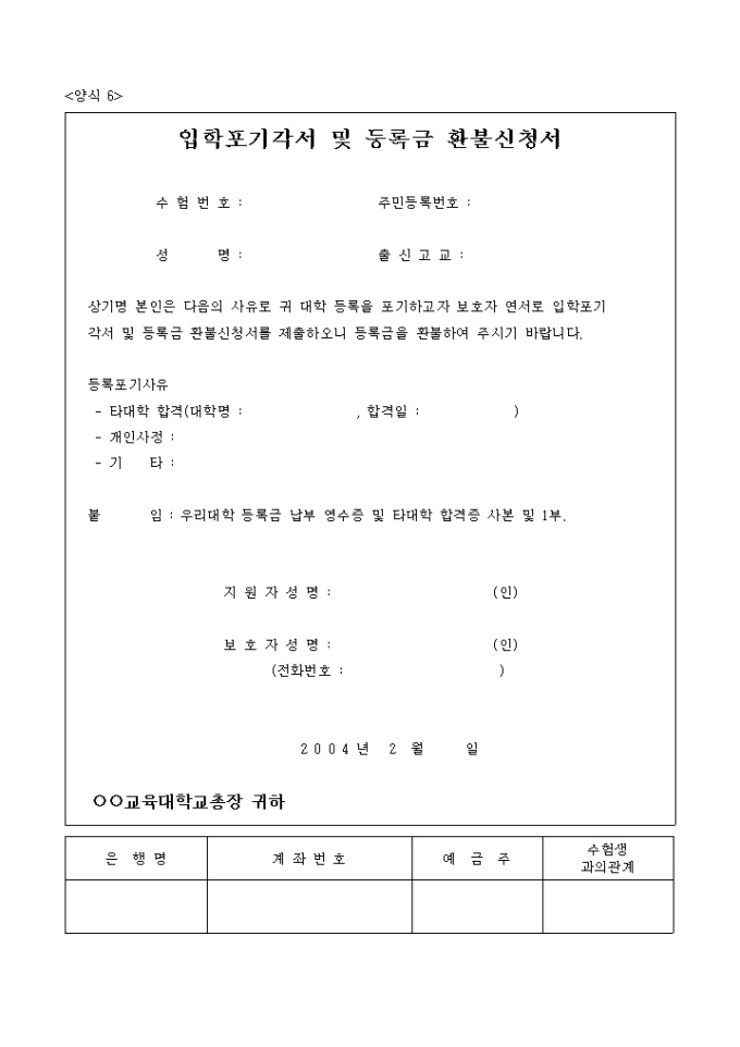 입학포기각서 및 등록금 환불신청서