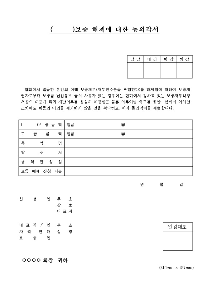 협회에서 발급한 본인의 아래 보증채무(채무인수분을 포함한다)를 해제함에 대하여 보증채권자로부터 보증금 납입통보 등의 사유가 있는 경우에는 협회에서 정하고 있는 보증채무약정서상의 내용에 따라 제반의무를 성실히 이행함은 물론 의무이행 촉구를 위한 협회의 여하한 조치에도 하등의 이의를 제기하지 않을 것을 확약하고, 이에 동의각서를 제출하는 보증해제에대한동의각서 양식입니다.