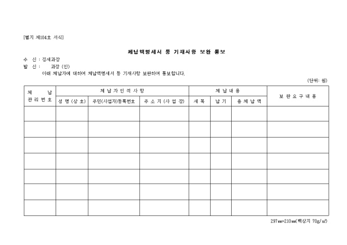 제104호 체납액명세서 등 기재사항 보완 통보 양식입니다. 평가제외분 총계, 공매의뢰분 등, 이의.심사.심판청구, 참가압류.교부청구, 소송진행.회사정리, 체납처분 유예 등을 기재합니다.