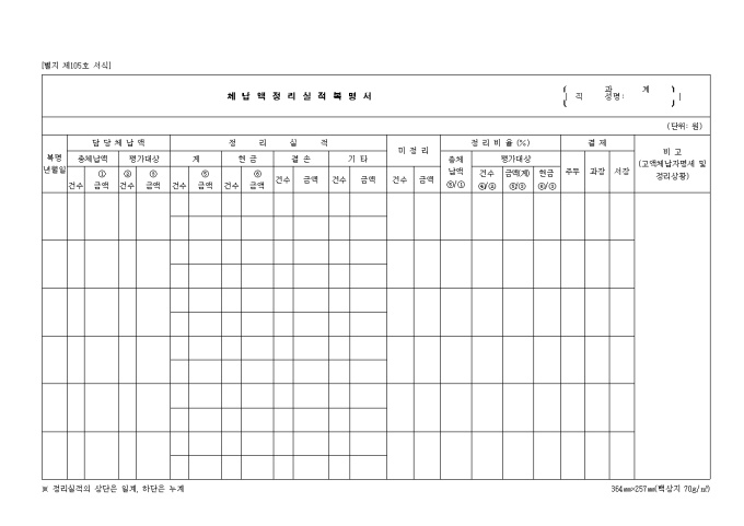 제105호 체납액 정리실적복명서 양식입니다. 담당체납액, 정리 실적, 미정리, 정리비율, 결재, 비고 등을 기재합니다.