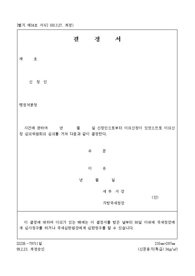 신청인,행정처분청을 기록하는 제34호 결정서(이의신청심의위원회)입니다. (2000.3.27. 개정)